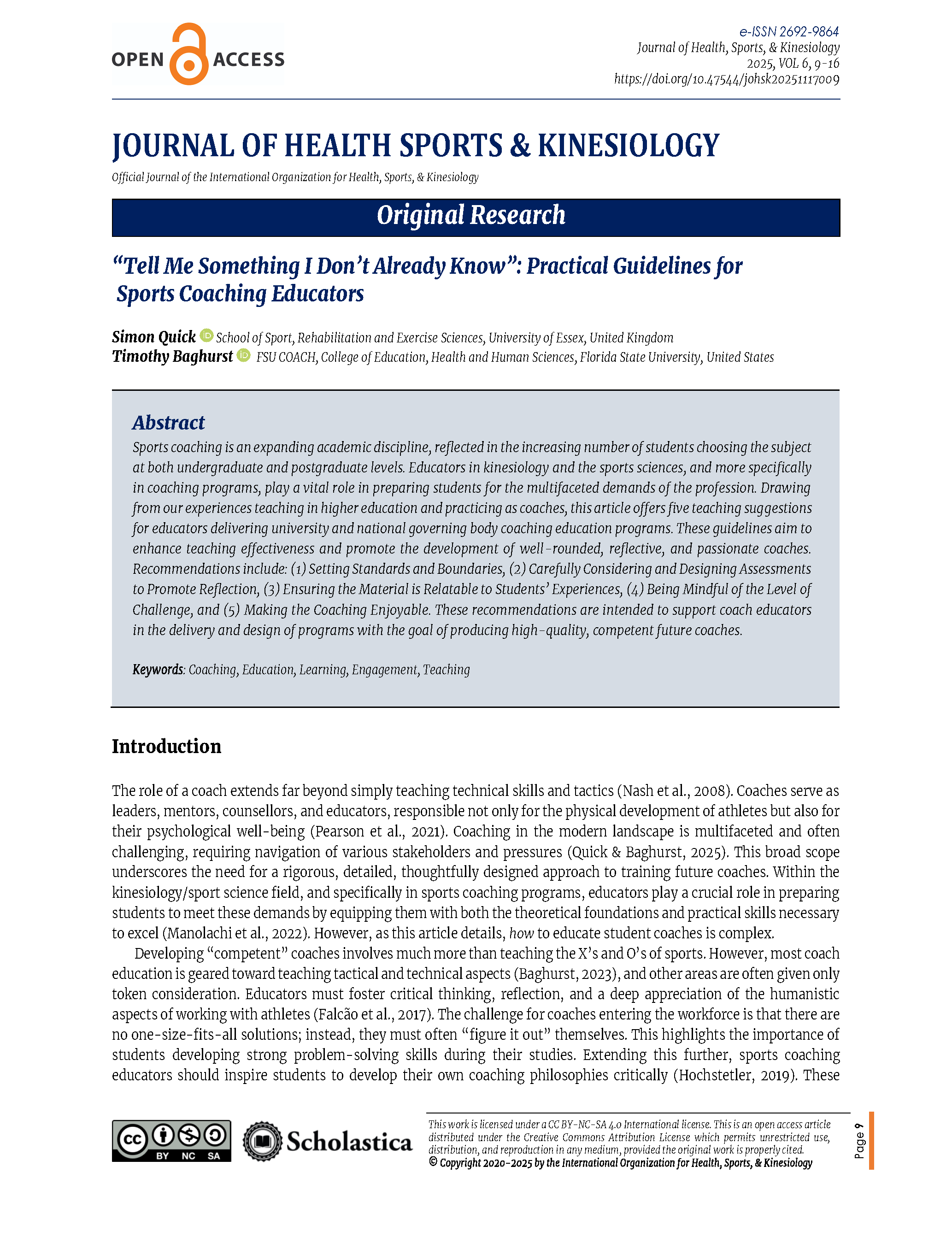 Quick, S., & Baghurst, T. (2025). “Tell me something I don’t already know”: Practical guidelines for sports coaching educators. The Journal of Health, Sports, and Kinesiology, 6, 9-16. https://doi.org/10.47544/johsk20251117009